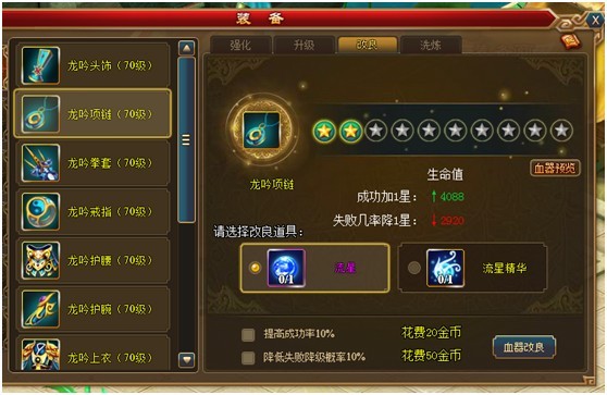 如果玩家担心在改良时降星,可选择花费20金币来提高改良10%的成功率,或是选择花费50金币来降低失败降级的10%概率。当然,如果你想极大的提升成功率的话,也可同时选择两种方式来预防改良失败降星的苦恼。
