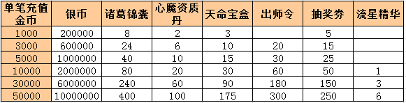 活动内容:活动期间,游戏内开启单笔充值活动,玩家每单笔充值一定金额,即可获得相应的充值奖励。