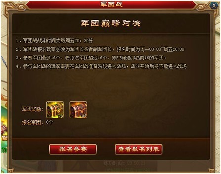参与条件:军团等级达到3级的军团长和副军团长可以报名每周军团战