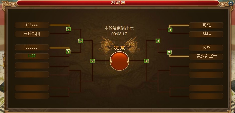 2) 每轮比赛前,每个玩家只能竞猜1对玩家的比赛结果,谁获得优胜。例如:8强赛,有8对玩家进行比赛,玩家只能选择1对玩家进行竞猜。