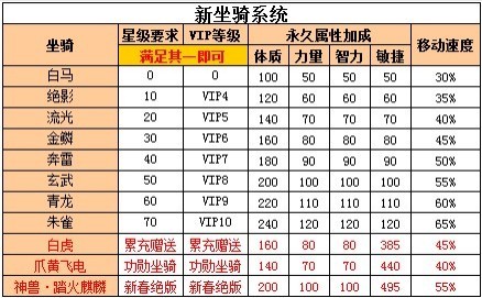 1)坐骑的解锁规则,除了以前的培养星级方式可以解锁外,增加VIP等级方式解锁,两种解锁方式满足一种即可;